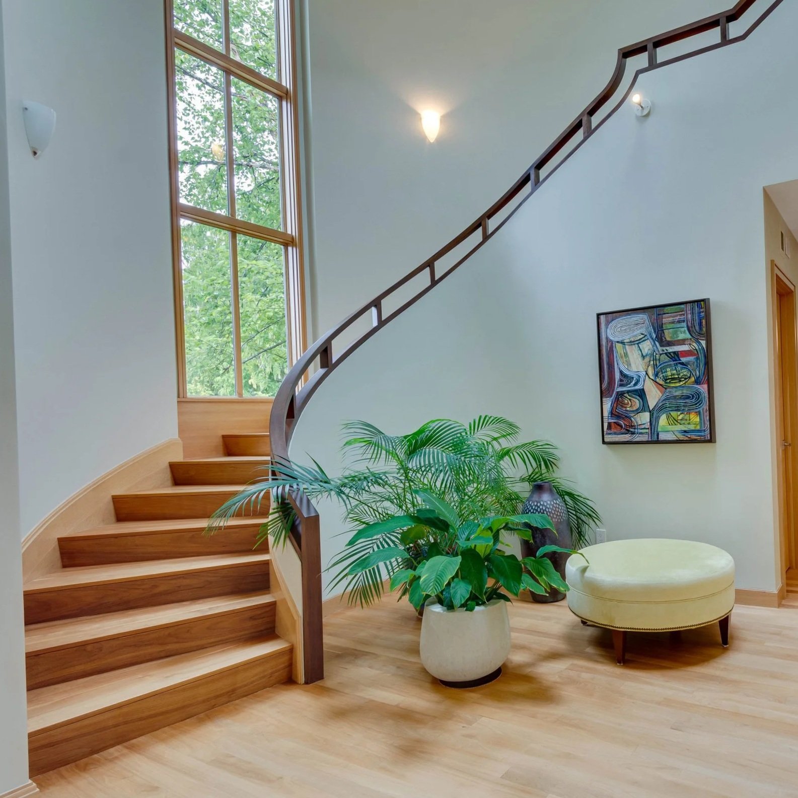 Inside, the home’s material palette reflects both craftsmanship and environmental mindfulness. Expansive Loewen fir windows, radiant-heated stone and walnut floors, and a sculptural oak staircase set the tone for light-filled, flowing interiors. A chef’s kitchen combines custom sustainable cabinetry, Caesarstone and Silestone countertops, and a porcelain and recycled glass backsplash. Original marble fireplace surrounds by Mark De Guidice and artisan-built steel railings highlight the home’s attention to detail, while five bedrooms, spa-inspired baths, and versatile spaces—including a library, office, music room, recreation room, and wine cellar—balance luxury with livability.